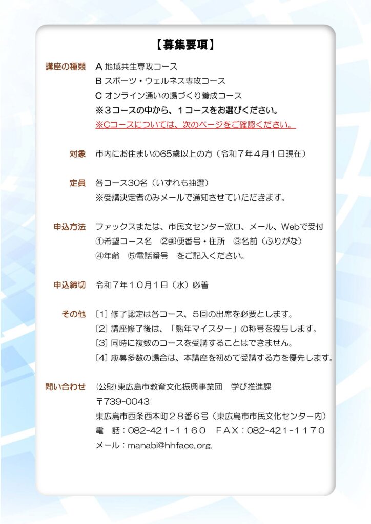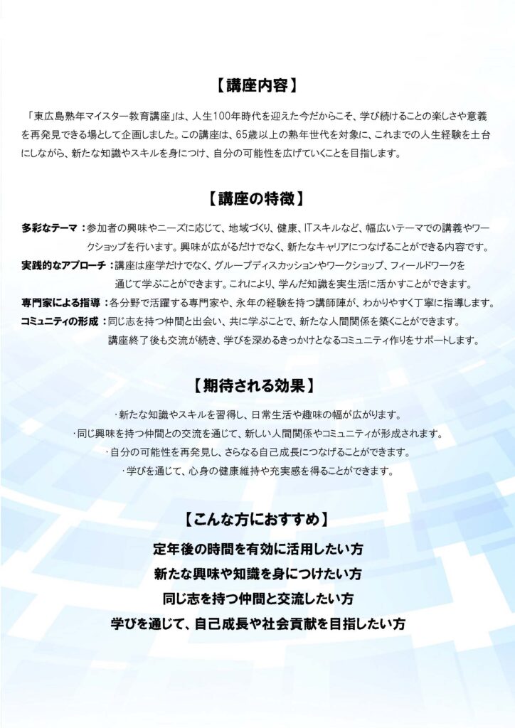 「東広島市熟年マイスター教育講座」~人生100年、あなたの学びを未来へ生かす~