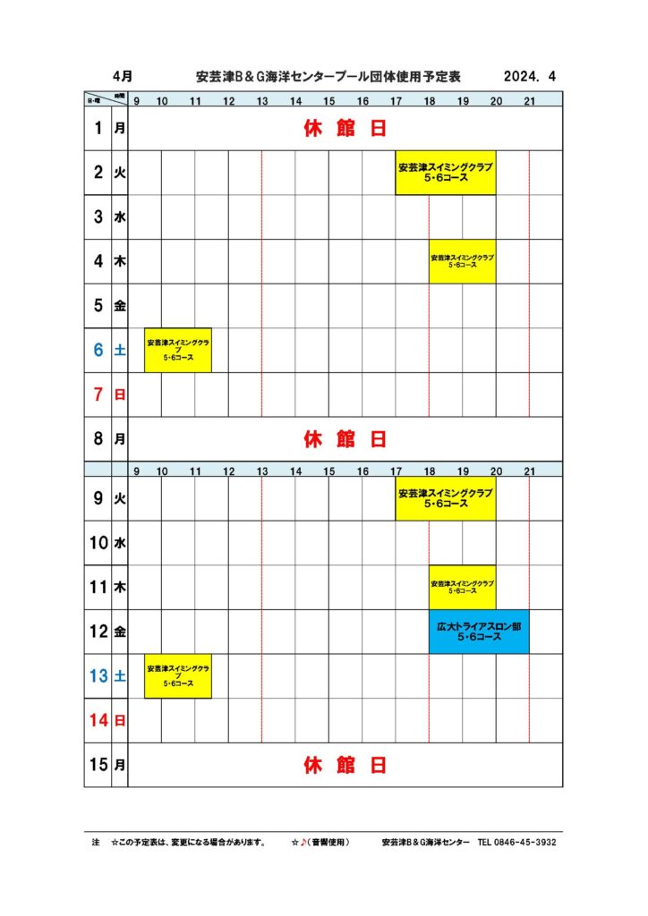 ■安芸津屋内プール団体使用予定表4月分 2024年3月22日 最終更新日時 : 2024年3月22日 yoshi 安芸津屋内プール団体使用予定表4月分です。 pooakitsul04_2024ダウンロード