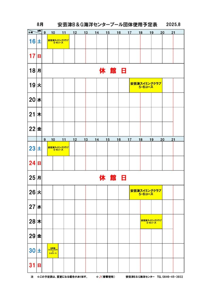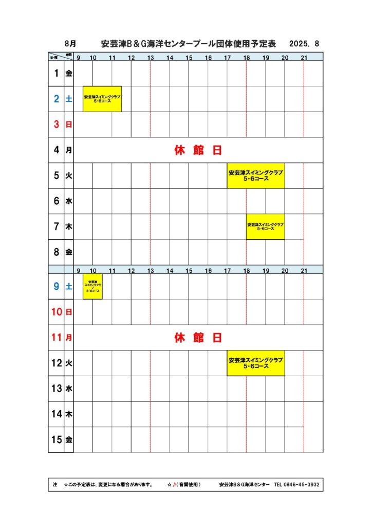■安芸津屋内プール団体使用予定表8月分 2025年7月28日 最終更新日時 : 2025年7月28日 yoshi 安芸津屋内プール団体使用予定表8月分です。 akitsupool08_2025ダウンロード
