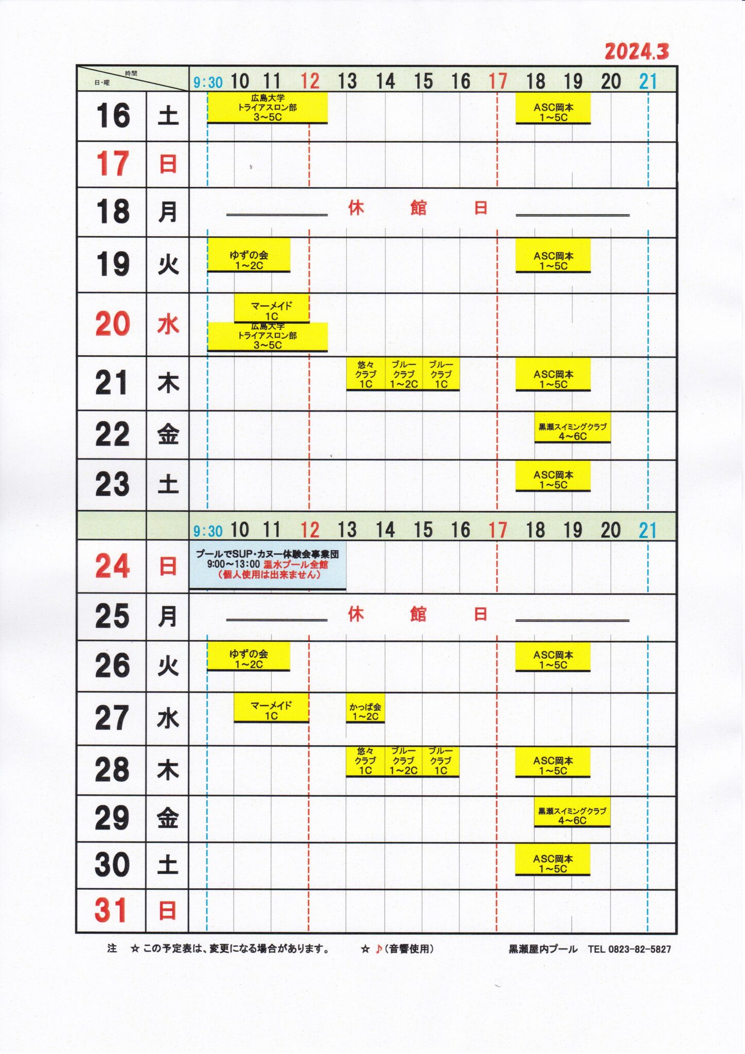 黒瀬屋内プール団体使用予定表3月分を掲載いたします。