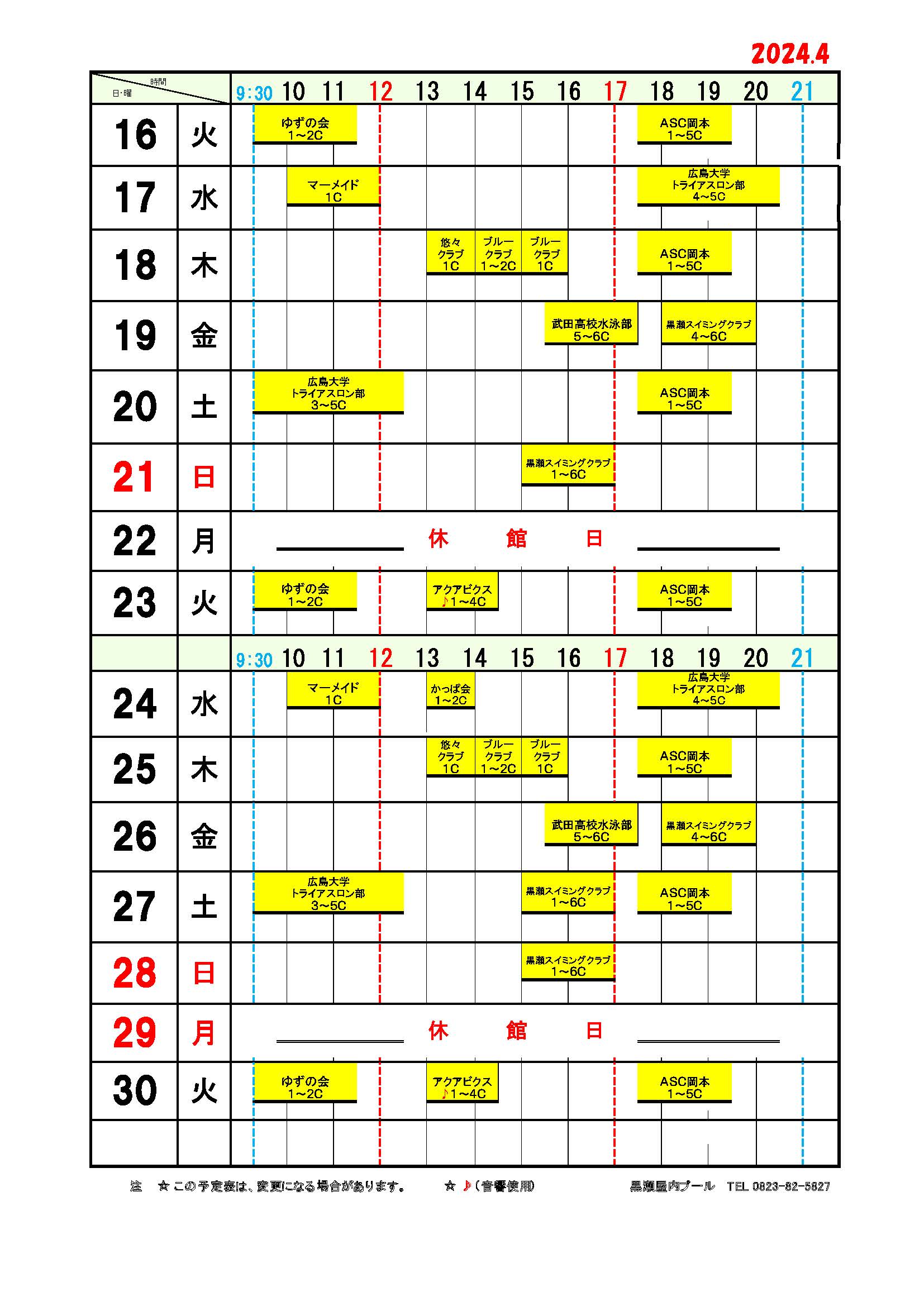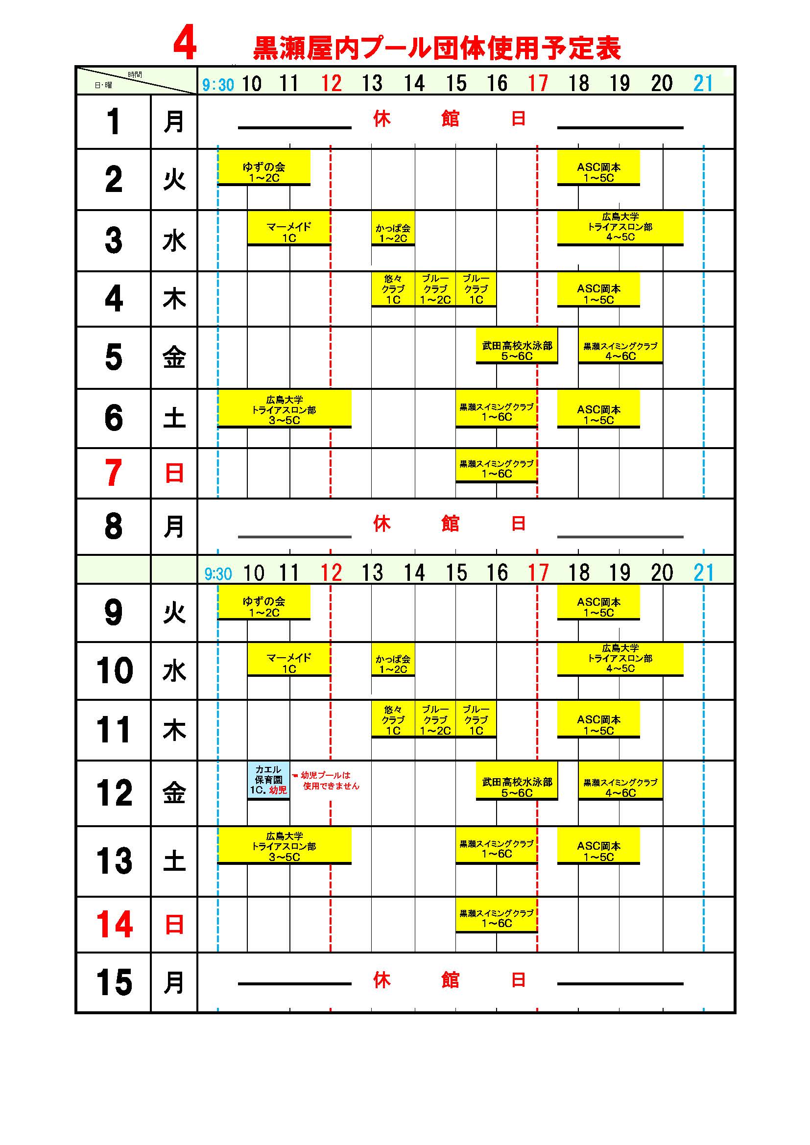 ■黒瀬屋内プール団体使用予定表4月分 2024年3月22日 最終更新日時 : 2024年3月28日 yoshi 黒瀬屋内プール団体使用予定表4月分を掲載いたします。 kurosepool4_2024ダウンロード