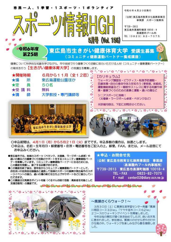【スポーツ情報HGH5月号】 2024年4月21日 最終更新日時 : 2024年4月21日 yoshi スポーツ情報HGH5月号、今回は「東広島市生きがい健康体育大学受講生募集」「みんなでボッチャ!交流会」などについてです。 HGH5_2024-1ダウンロード