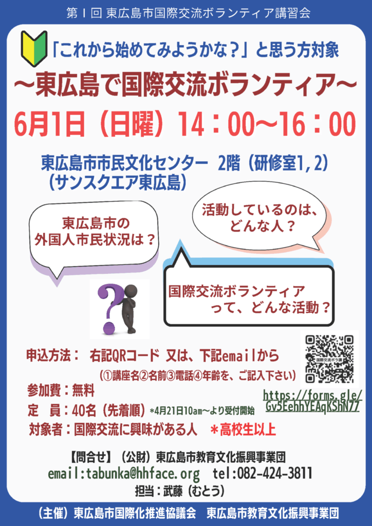 6月1日(日)14:00-16:00、東広島市市民文化センター2階(研修室1,2)で、東広島市の外国人市民の現状、東広島市国際交流ボランティアの活動内容を紹介する講座を開催します。実践者の体験も聞けます。対象者は、国際交流に興味がある人、高校生以上、申込は、4月21日午前10時~、先着順。詳細は、チラシをご確認下さい。