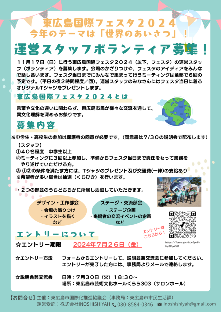 東広島国際(ひがしひろしまこくさい)フェスタ 2024 のボランティア・スタッフを募集(ぼしゅう)します。会場(かいじょう)の かざりづけ や フェスタのアイデアを みんなで話(はな)し合(あ)います。