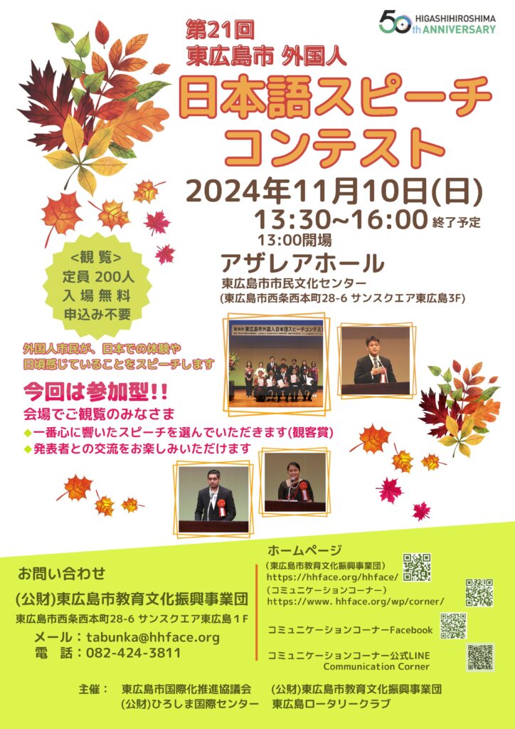 【第21回東広島市外国人 日本語スピーチコンテスト】 2024年10月3日 最終更新日時 : 2024年10月3日 yoshi 11月10日(日)13:30~16:00, 東広島市市民文化センター3階アザレアホールで、日本語スピーチコンテストがあります。外国人が、日本での体験や、自分の考えていることなどを話します。入場無料です。申込みはいりません。ぜひ 見に来てください!