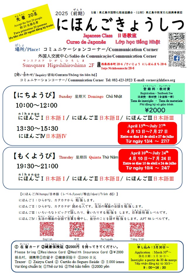 As aulas de japonês já começaram. Você ainda pode se inscrever para qualquer classe, mas não demore muito. Para se inscrever, compareça ao Salão de Comunicação entre 9h00 e 16h30. Traga seu Zairyu Card e 2.000 ienes. Verifique no folheto.