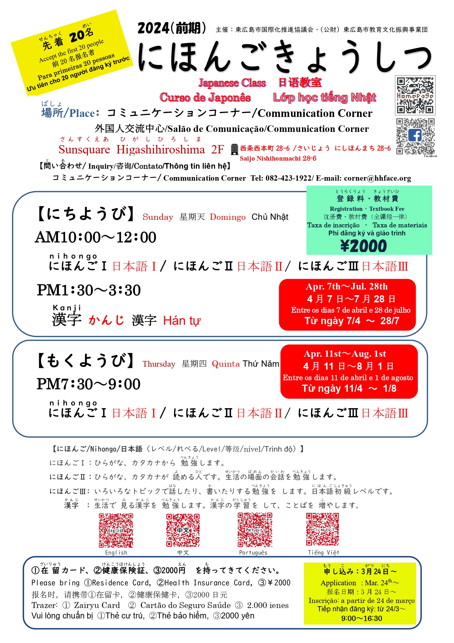 4月(がつ)から2024年(ねん)前期(ぜんき)にほんご教室(きょうしつ)が始(はじ)まります! 申込(もうしこみ)は3月(がつ)24日(にち)から始(はじ)まります。在留(ざいりゅう)カード、健康保険証(けんこうほけんしょう)と ¥2000を もって、9:00~16:30に コミュニケーションコーナーに きてください。