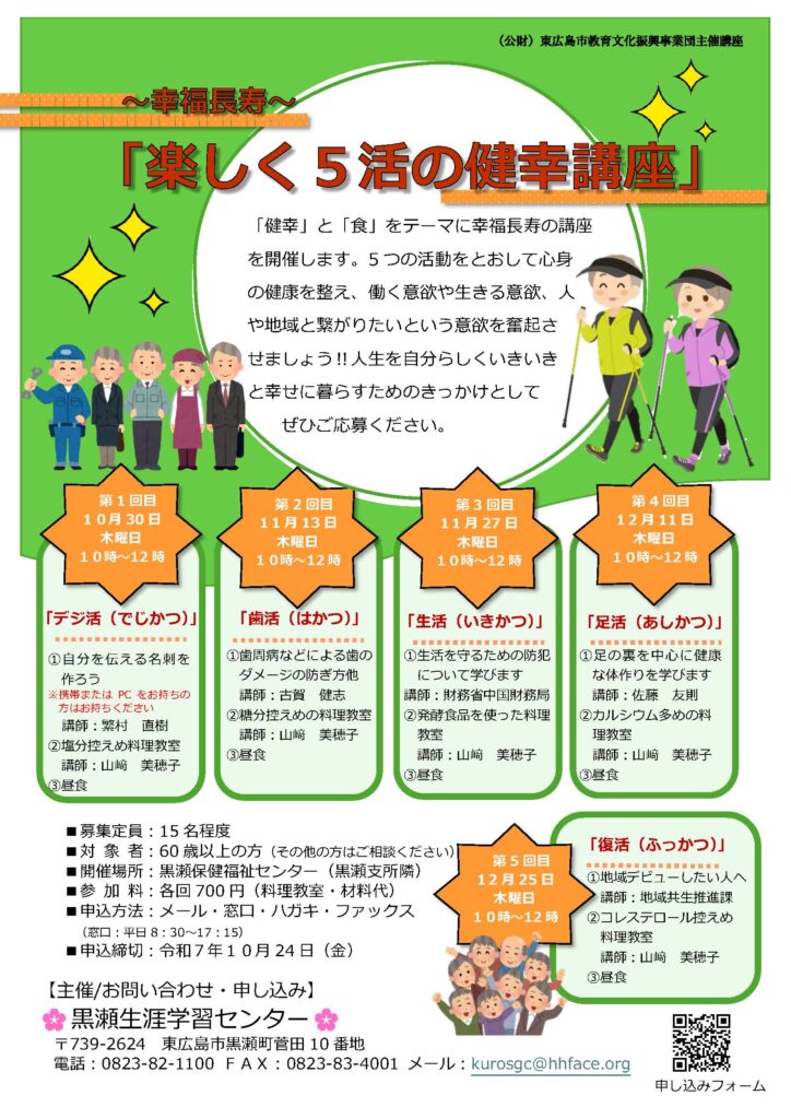 60歳以上の方を対象としたデジ活・歯活・生活・足活・復活と題した5活の座学と調理講座を開催します。楽しい体験を通して、仲間づくりや健康づくりをしませんか?