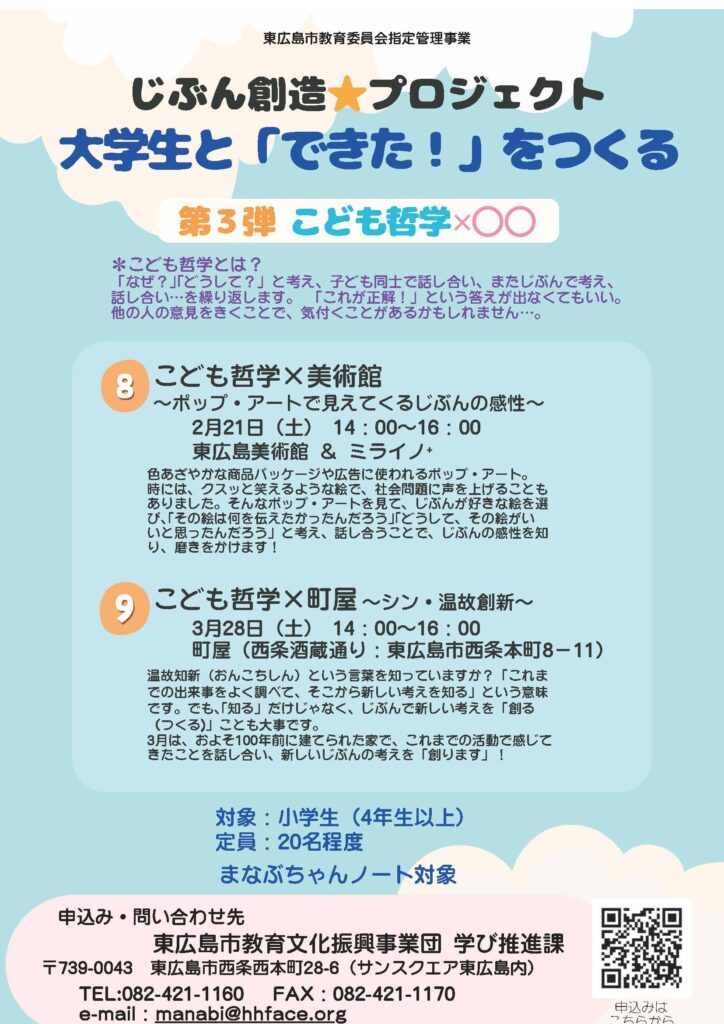 じぶん創造★プロジェクト【第3弾】〜大学生小学生〜大学生と「できた!」をつくる大学生と「できた!」をつくる〔こども哲学×○○:全2回〕 2026年1月17日 最終更新日時 : 2026年1月17日 yoshi このプロジェクト、ぜんぶ大学生が企画中!小学生と大学生で、「学び」「体験」「発見」を楽しむスペシャル講座の第3弾(⑧~⑨)で、こども哲学がテーマの対話プログラムです!「なぜ?」「どうして?」と考え、子ども同士で話し合い、またじぶんで考え、話し合い…を繰り返します。 「これが正解!」という答えが出なくてもいい。他の人の意見をきくことで、気付くことがあるかもしれません…。 詳しくはチラシをクリック‼︎