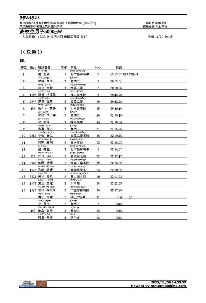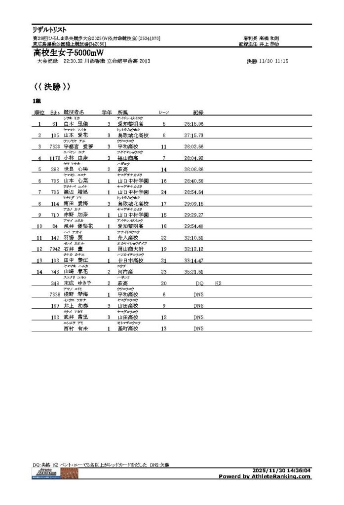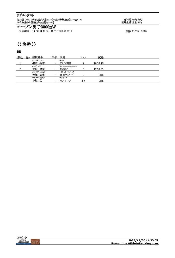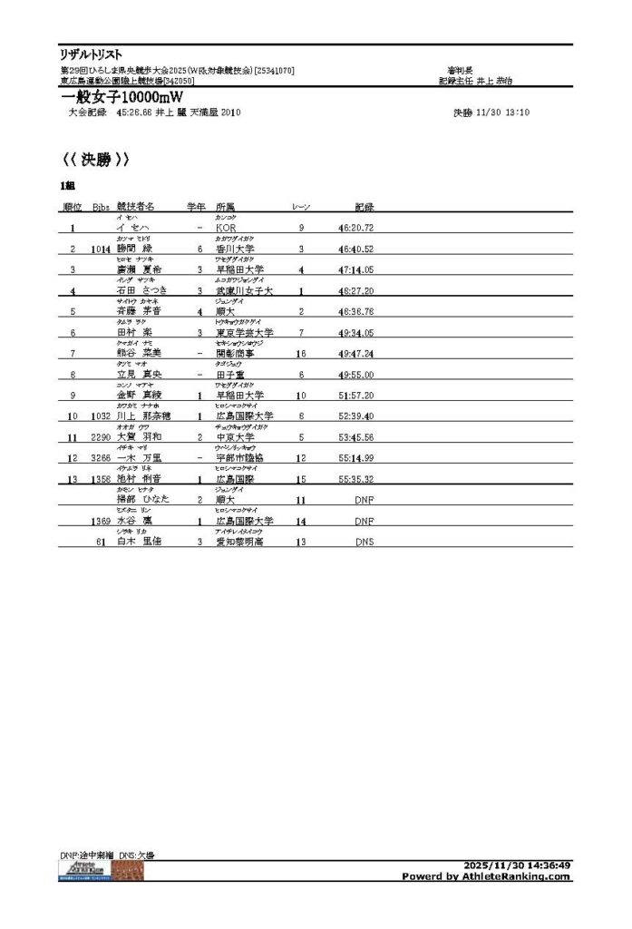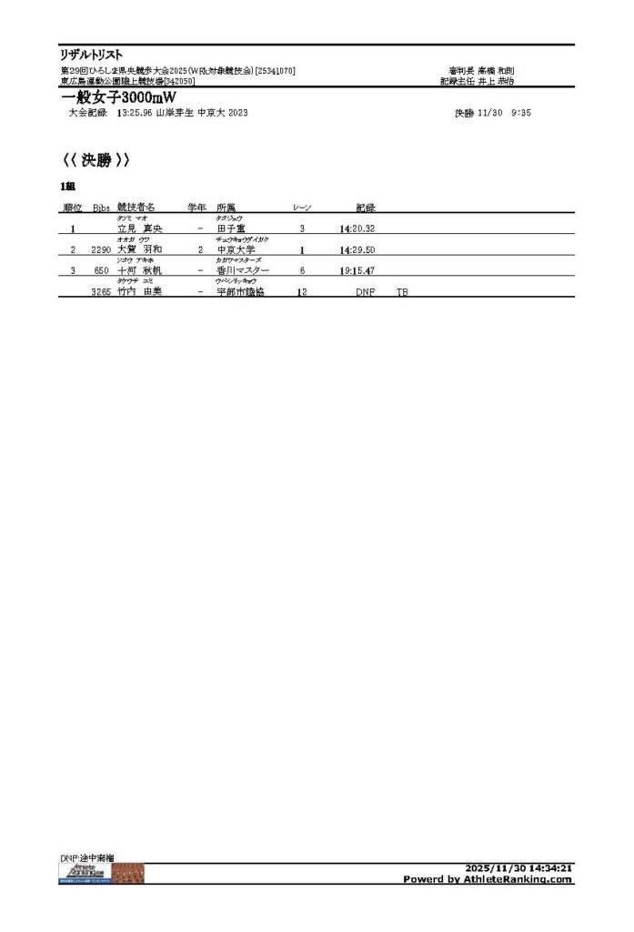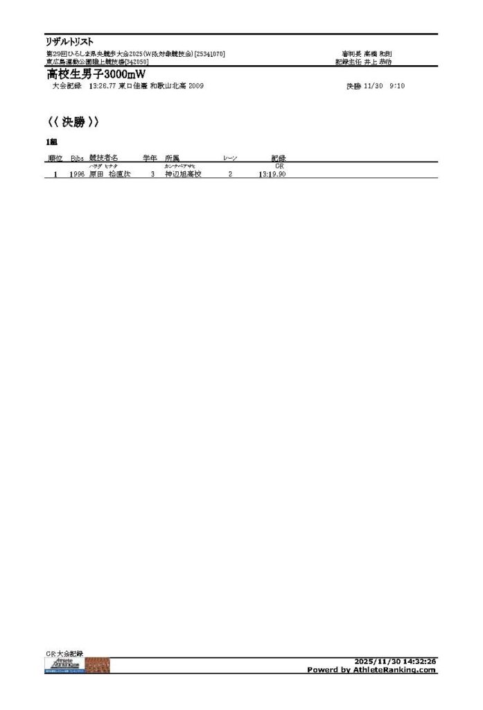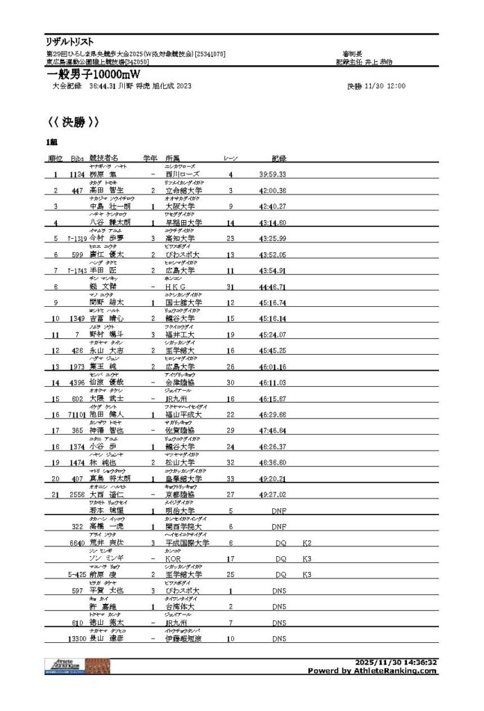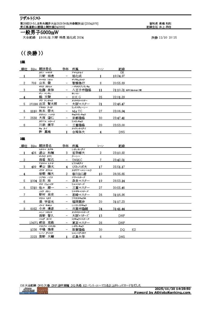 第29回ひろしま県央競歩大会2025 2025年12月1日 最終更新日時 : 2025年12月1日 yoshi 【第29回ひろしま県央競歩大会結果報告】 大会結果を報告します。 リザルト2025PDFダウンロード