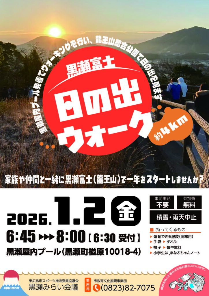 黒瀬屋内プールを出発し、龍王山総合公園で日の出を見て黒瀬屋内プールに戻るまで、約4キロメートルのウォーキングをします。