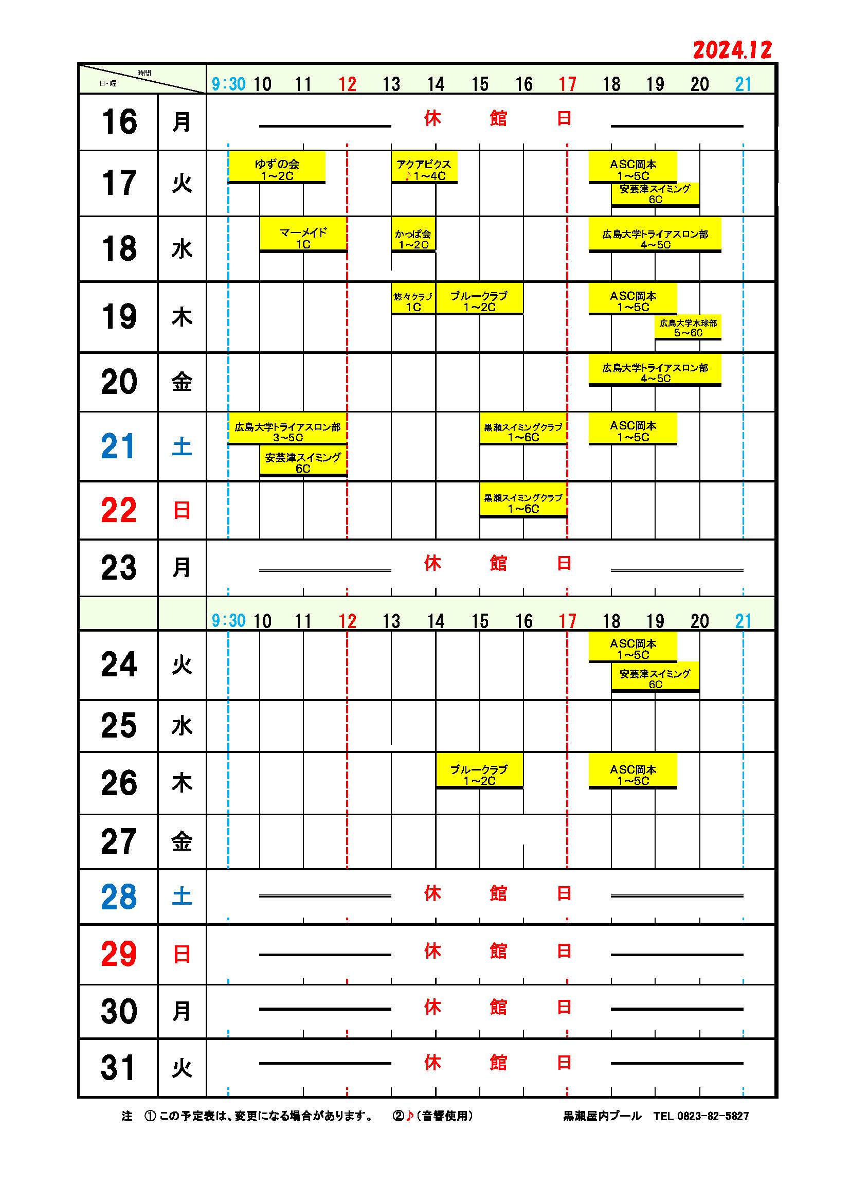 黒瀬屋内プール団体使用予定表12月分