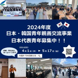 2024年度日本・韓国青年親善交流事業の日本代表青年を募集します! 詳細は内閣府のホームページをご覧ください。 ◎募集期間:2024年4月1日(月)〜5月17日(金)正午(参加申込書必着) ◎内閣府ホームページ:htt […]