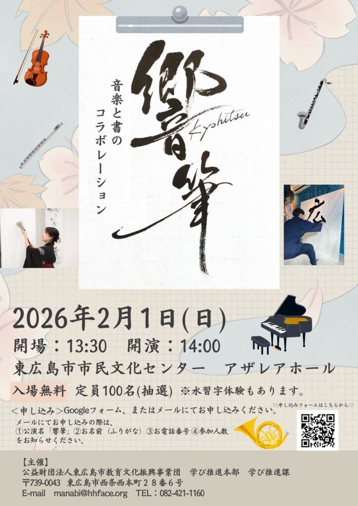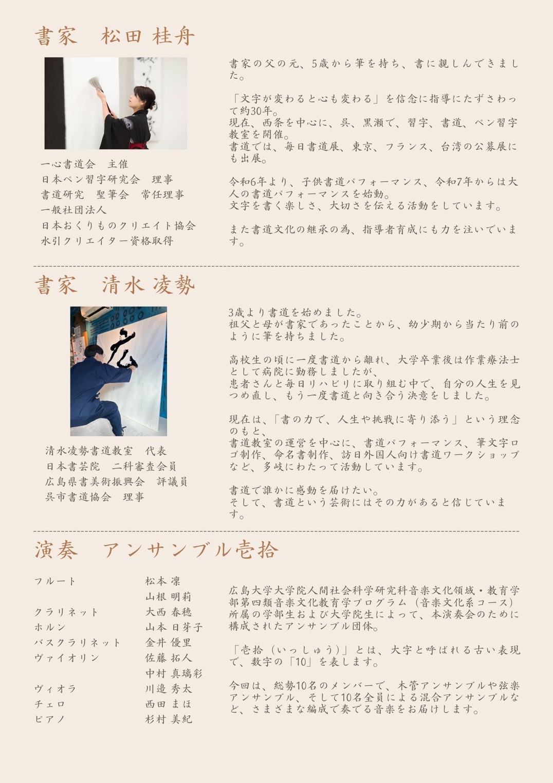 内容:音楽と書道パフォーマンスのコラボレーション 水書道体験もあります