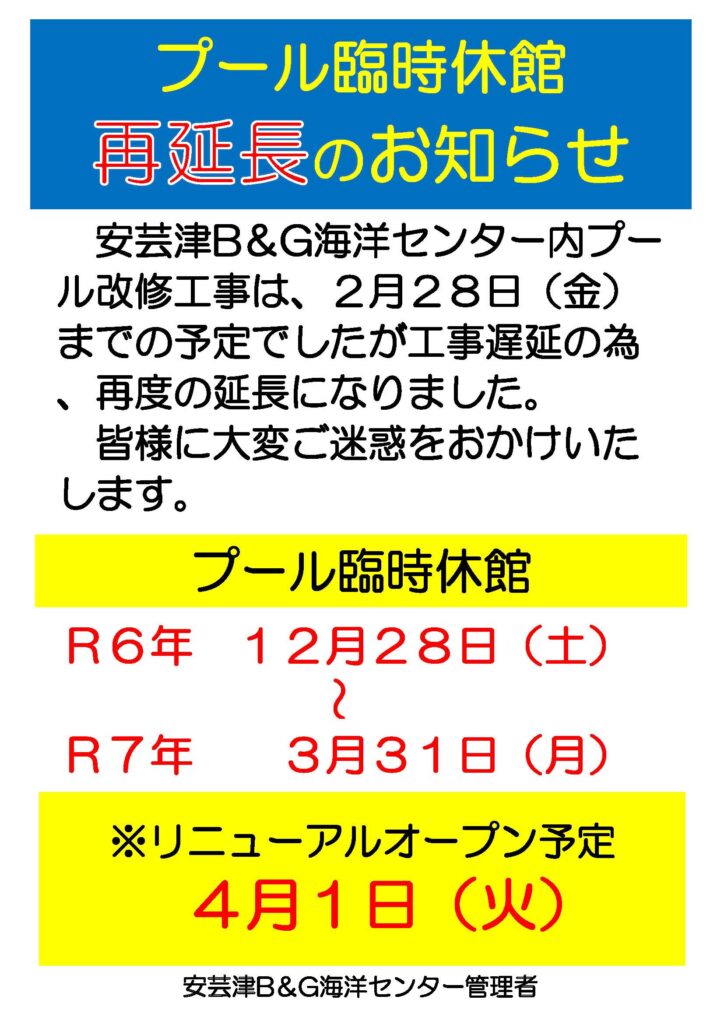 安芸津B&G海洋センタープールの改修工事を令和6(2024)年5月7日(火)から2月28日(金)までとお知らせしておりましたが、令和7年3月31日まで延長することとなりました。その期間プールの利用ができません。皆様にはご不便をおかけいたしますが、ご理解いただきますようにお願いいたします。