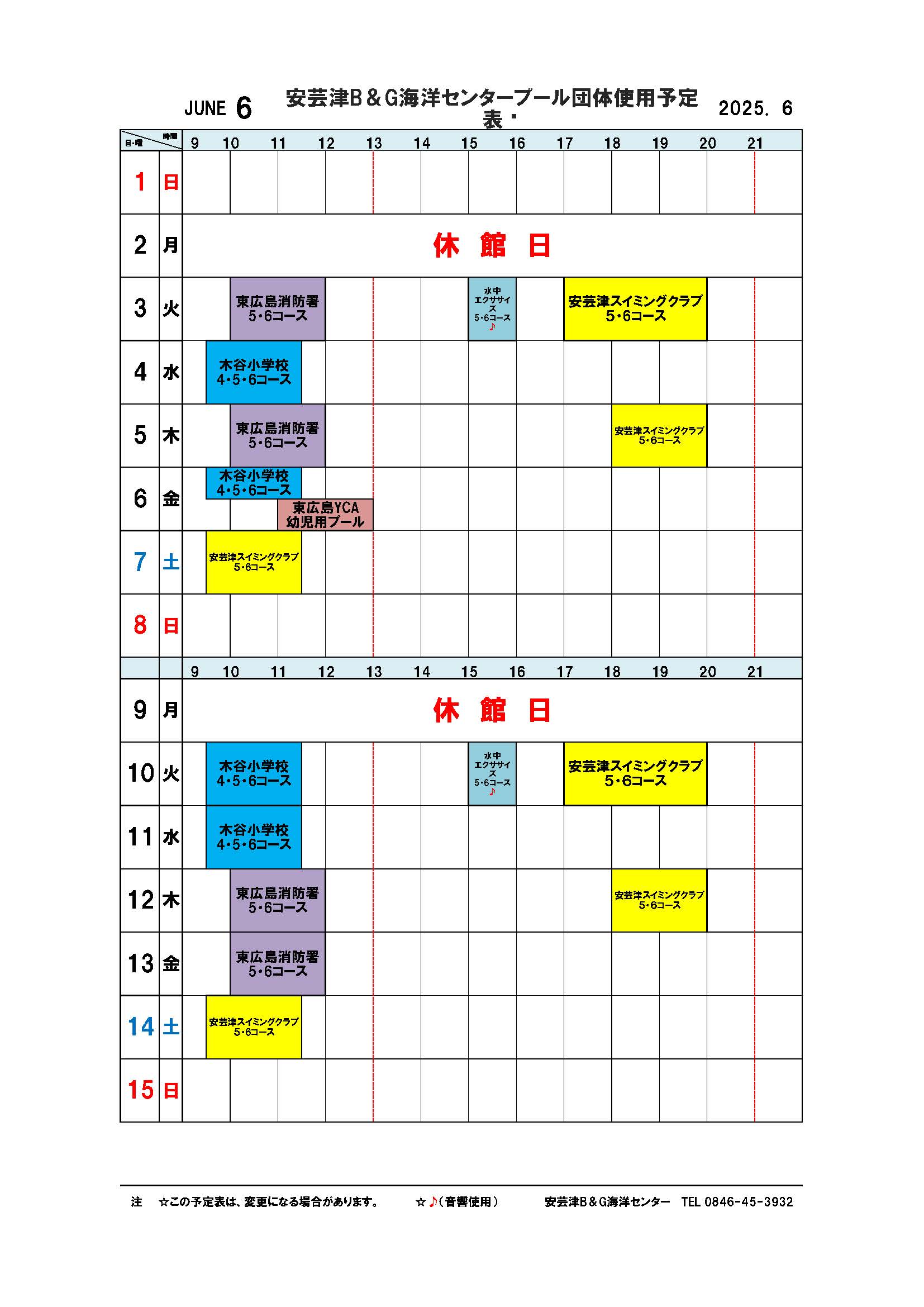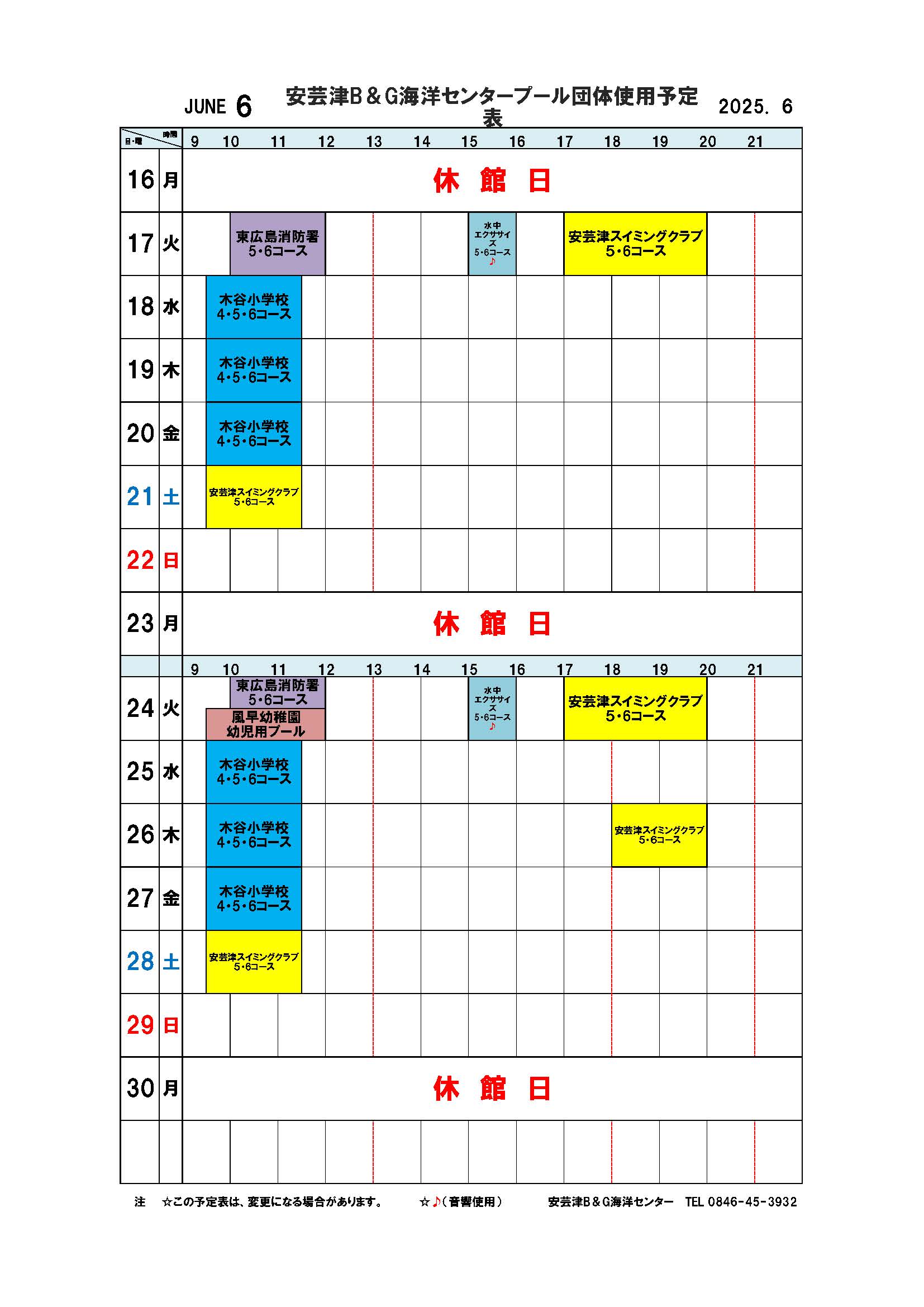安芸津屋内プール団体使用予定表6月分 2025年5月28日 最終更新日時 : 2025年5月28日 kihara 安芸津屋内プール団体使用予定表6月分です。 akitsupool6_2025ダウンロード