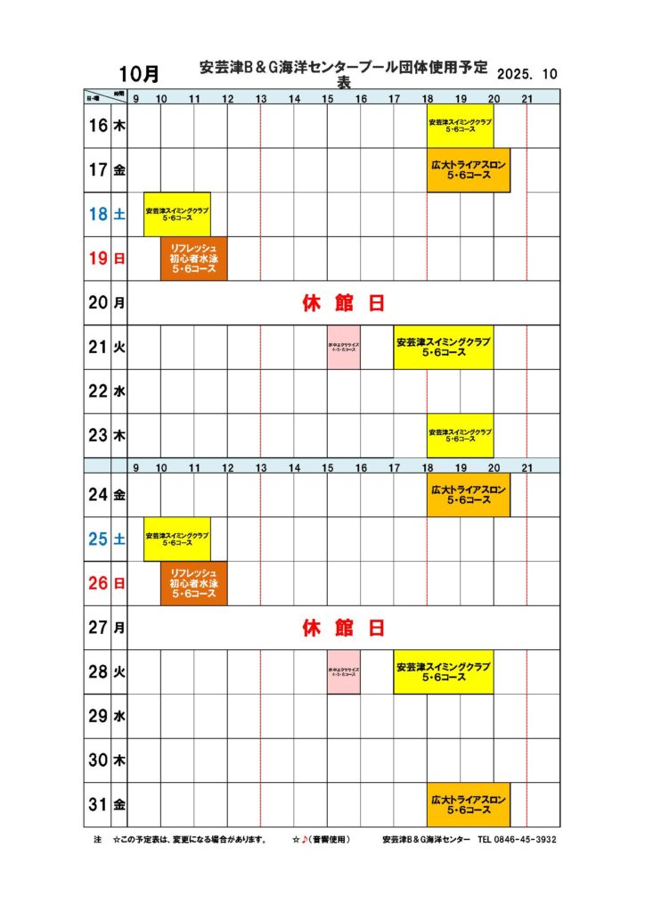 安芸津屋内プール団体使用予定表10月分です。