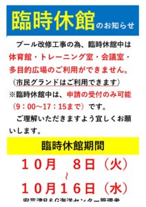 プール改修工事の為、臨時休館中は体育館・トレーニング室・会議室・多目的広場のご利用ができません。 (市民グランドはご利用できます) ※臨時休館中は、申請の受付のみ可能です(9:00〜17:15) ご理解いただきますよう […]