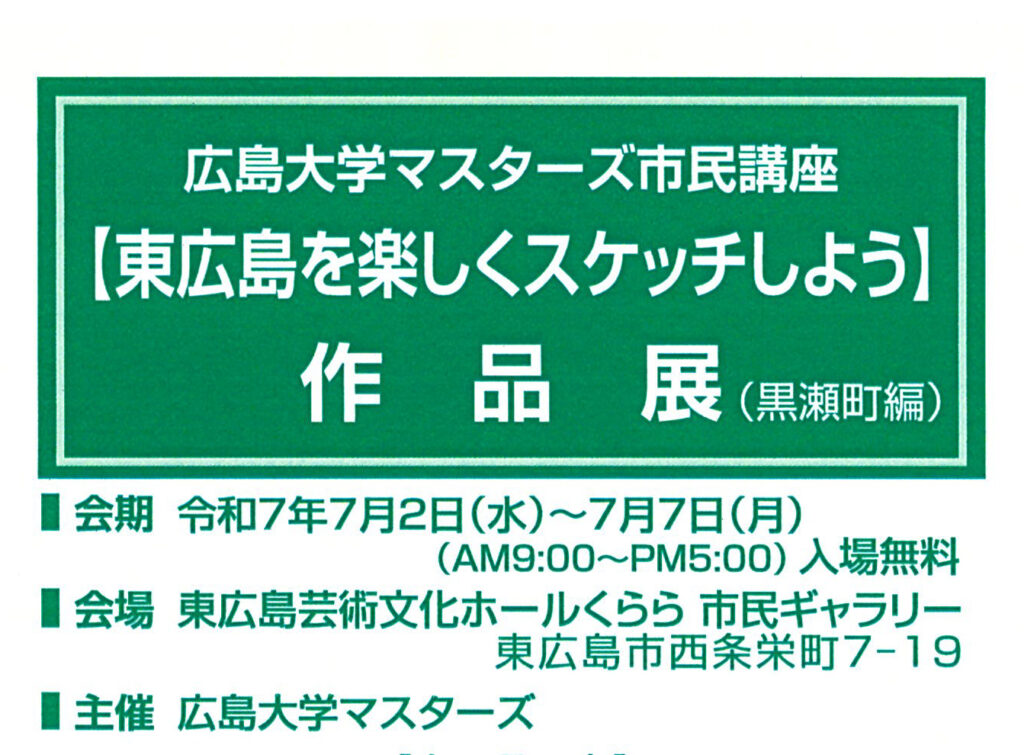 【東広島を楽しくスケッチしよう作品展(黒瀬町編)】 2025年7月1日 最終更新日時 : 2025年7月29日 yoshi 5月から6月にかけて黒瀬生涯学習センターで行われた「東広島を楽しくスケッチしよう(黒瀬町編)」で描いた絵の作品展が始まりました。ぜひお越しください。入場無料です。⚫️会期:令和7年7月2日(水)〜7日(月) 9:00~17:00⚫️会場:東広島市芸術文化ホールくらら市民ギャラリー(東広島市西条栄町7−19) \ 最新情報をチェック /
