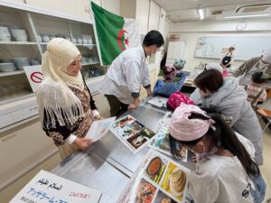 1月24日土曜日、御薗宇地域センターで東広島ミニ万博の第4回を行いました。午前からの「世界の料理コース」では、アルジェリア出身のスヒラさんを講師に迎え、伝統料理の「タジン」に挑戦。 今回は、シナモンがふんわり香る特製ソースでミートボールをじっくり煮込み、仕上げに香ばしいアーモンドとパセリを添えた本格的な一品を仕上げました。最後はみんなでパンと一緒に、アルジェリアの家庭の味を楽しみました。