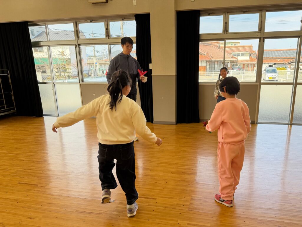 午後の「世界のあそびコース」では、中国出身の広島大学留学生・耿耀耀さんとともに、中国・漢の時代に発祥した遊び「ジェンズ(Jian Zi)」を体験しました。子どもたちはコツを教わりながら何度も挑戦し、元気いっぱいに体を動かしながら、国や言葉の違いを越えた交流を深めました。