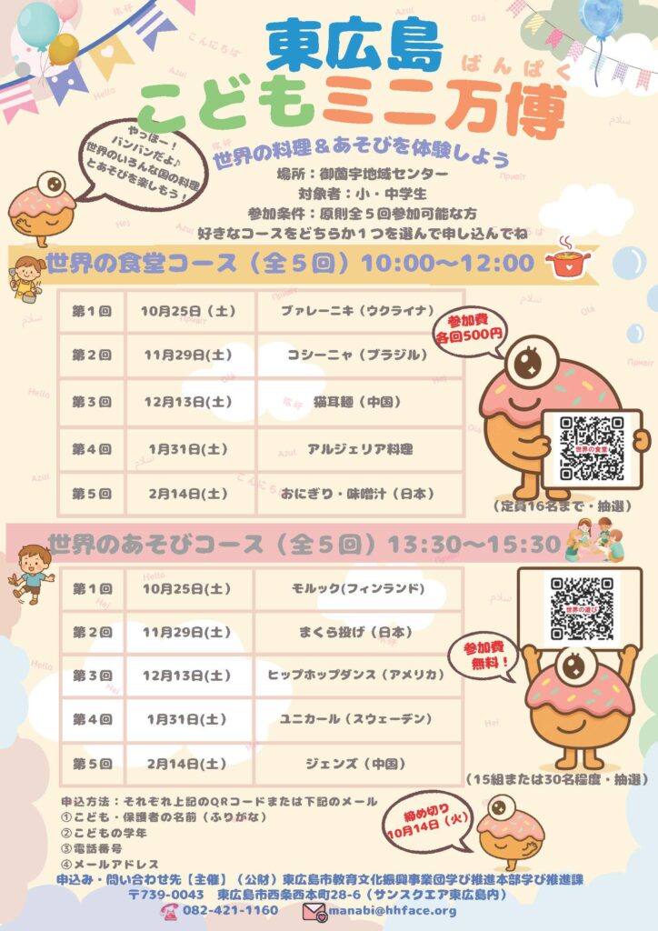 東広島こどもミニ万博がはじまりました 2025年11月5日 最終更新日時 : 2025年11月5日 yoshi 10月25日、御薗生地域センターで「東広島こどもミニ万博」がはじまりました。午前中は「世界の食堂コース」で急きょ内容を変更して「おにぎり・味噌汁(日本)」をみんなで作りました。午後からは「世界のあそびコース」としてモルック(フィンランド)で遊びました。これから全5回でいろんな国の料理や遊びを体験していきます。\ 最新情報をチェック /