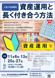 2024年からNISAがリニューアルされ、格段に使い易くなります。NISAをはじめとし株式投資や投資信託など、資産運用のキホンを楽しく学びます。 講師:広島県金融広報委員会アドバイザー 倉橋 孝博さん日時:11月6日、1 […]