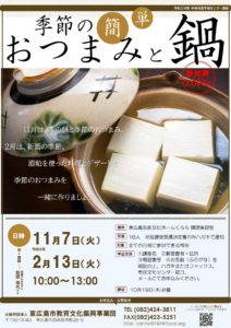 11月は、冬の鍋と季節のおつまみ、2月は、新酒の季節。酒粕を使った料理とデザートと季節のおつまみを一緒に作りましょう。 講師:酒蔵のおかみ 前垣 佳代さん日時:11月7日(火)、令和6年2月13日(火)いずれも10:00 […]
