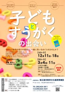 子どもと数学の遊びの関係に、一緒に思いをめぐらせませんか?絵本の紹介もあります。どなたでもどうぞ! 講師:伊森 寿子さん(元中学校教諭/現在は、2男1女の子育てに奮闘中)日時:Aコース/12月11日、18日 終了しま […]