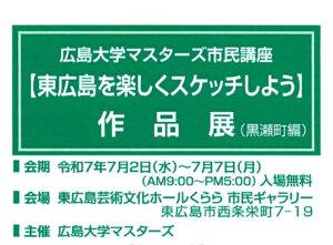 5月から6月にかけて黒瀬生涯学習センターで行われた「東広島を楽しくスケッチしよう(黒瀬町編)」で描いた絵の作品展が始まりました。ぜひお越しください。入場無料です。 ⚫️会期:令和7年7月2日(水)〜7日(月) 9:00 […]