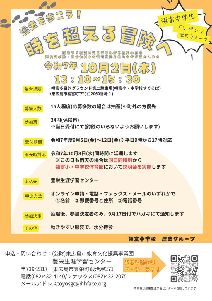 内容:福富中学生は「関係人口の増加」をテーマに、6グループが探求的な学習に取り組んでいます。そのうちの「歴史グループ」が、企画・実施する歴史ウォーク。地域のお宝史跡「旧竹仁村水力発電所跡」「阿良井城跡」を案内します。