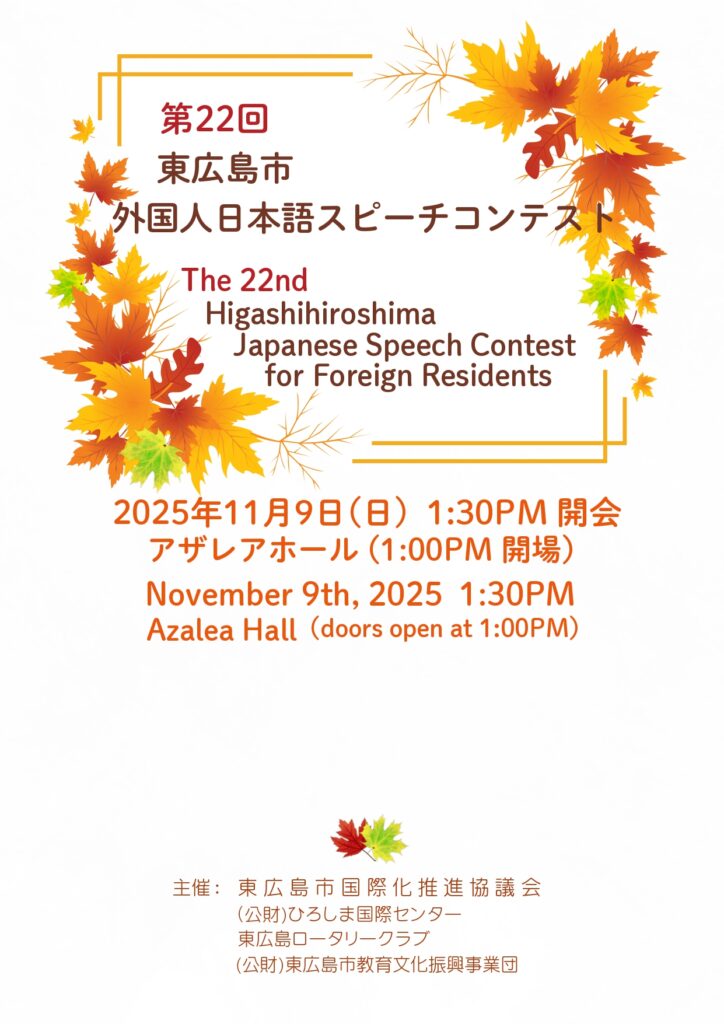 11月9日(日)、第22回東広島市外国人日本語スピーチコンテストが開催されました。審査の結果、各賞の受賞者は以下のとおりです。