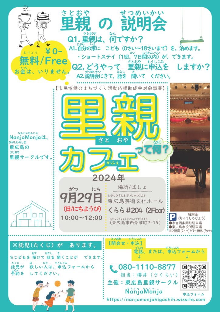 【里親(さとおや)の説明会(せつめいかい)】 2024年9月20日 最終更新日時 : 2024年9月20日 kihara 9月29日日曜(にちようび)、10:00~12:00、「里親(さとおや)の説明会(せつめいかい)」が あります。「里親(さとおや)」とは、こどもを 自分(じぶん)の家(いえ)に 泊(と)めて 預(あず)かる人(ひと)です。こどもを 1日~7日以内(いない)で 預(あず)けたい人(ひと)は、説明会(せつめいかい)で 話(はなし)を 聞(き)いて ください。申込(もうしこみ)方法(ほうほう)など、もっと知(し)りたい人(ひと)は、チラシを 見(み)て ください。 Bluesky