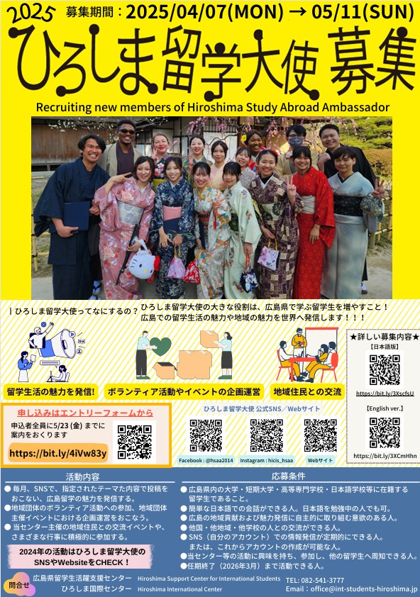 The Hiroshima Support Center for International Students is recruiting Hiroshima Study Abroad Ambassadors for the 2025 academic year. Great opportunity to make new friends and gain valuable experience. Please visit the following link for details: