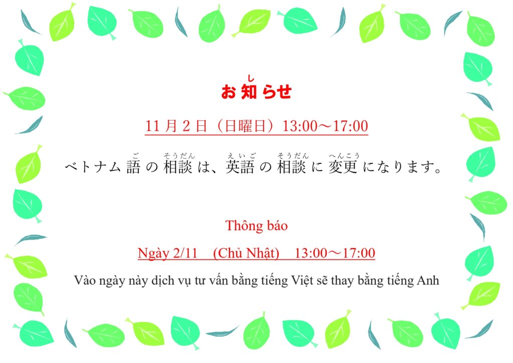 【11月2日ベトナム語相談なし】【Ngày 2/11 không có dịch vụ tư vấn bằng Tiếng Việt】 2025年10月24日 最終更新日時 : 2025年10月24日 kihara Bluesky