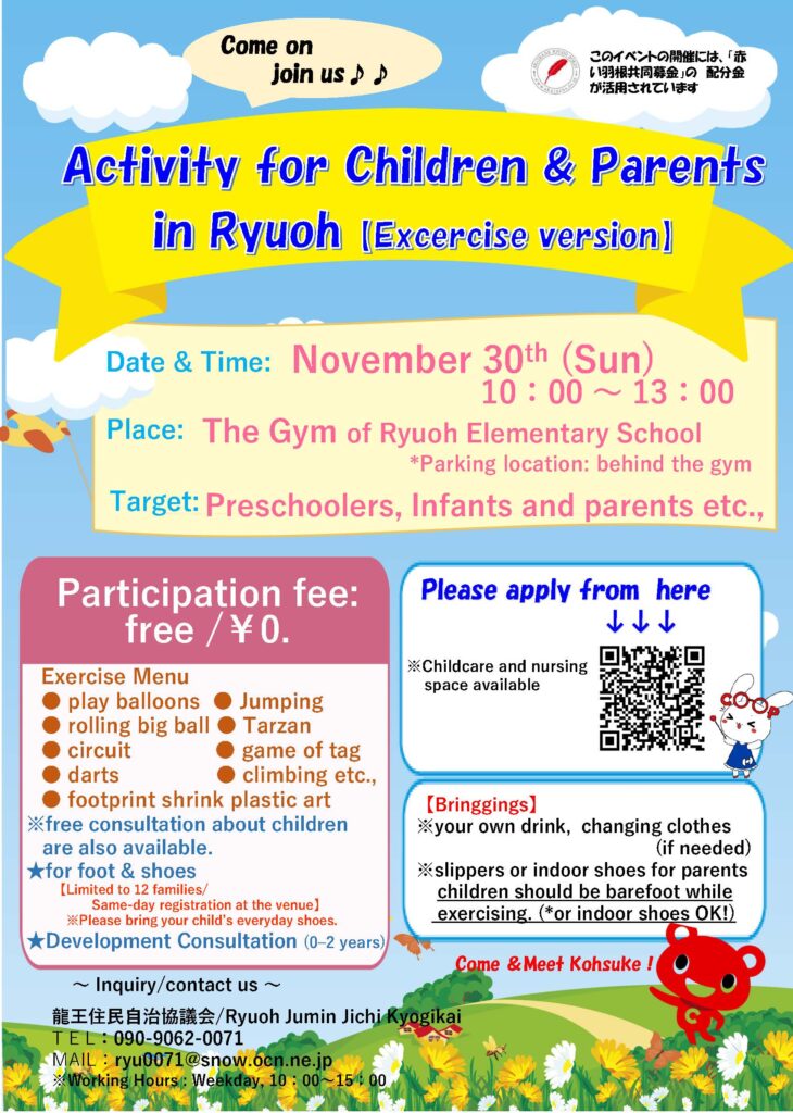 Dia 30 de novembro (domingo), das 10h00 às 13h00, haverá um evento lúdico para pais e filhos no ginásio da Escola Primária Ryuo, destinado a crianças menores de 6 anos, da pré-escola e até mesmo crianças ainda mais novas. A entrada é gratuita (0 ienes). Pais e filhos interessados em participar devem se inscrever. Para mais informações, consulte o folheto informativo.