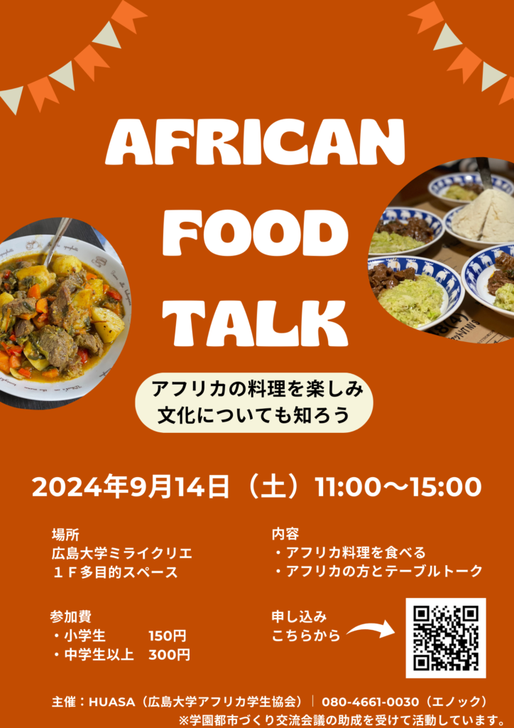 9月14日(土どようび)11:00~15:00 広島大学(ひろしまだいがく)ミライクリエで”African Food Talk”があります。アフリカの料理(りょうり)を食(た)べながら、アフリカについて学(まな)べます。定員(ていいん)は先着順(せんちゃくじゅん)で60人(にん)です。申込(もうしこみ)はこちらから→https://forms.gle/W5UkSsieyMBMpUQr7