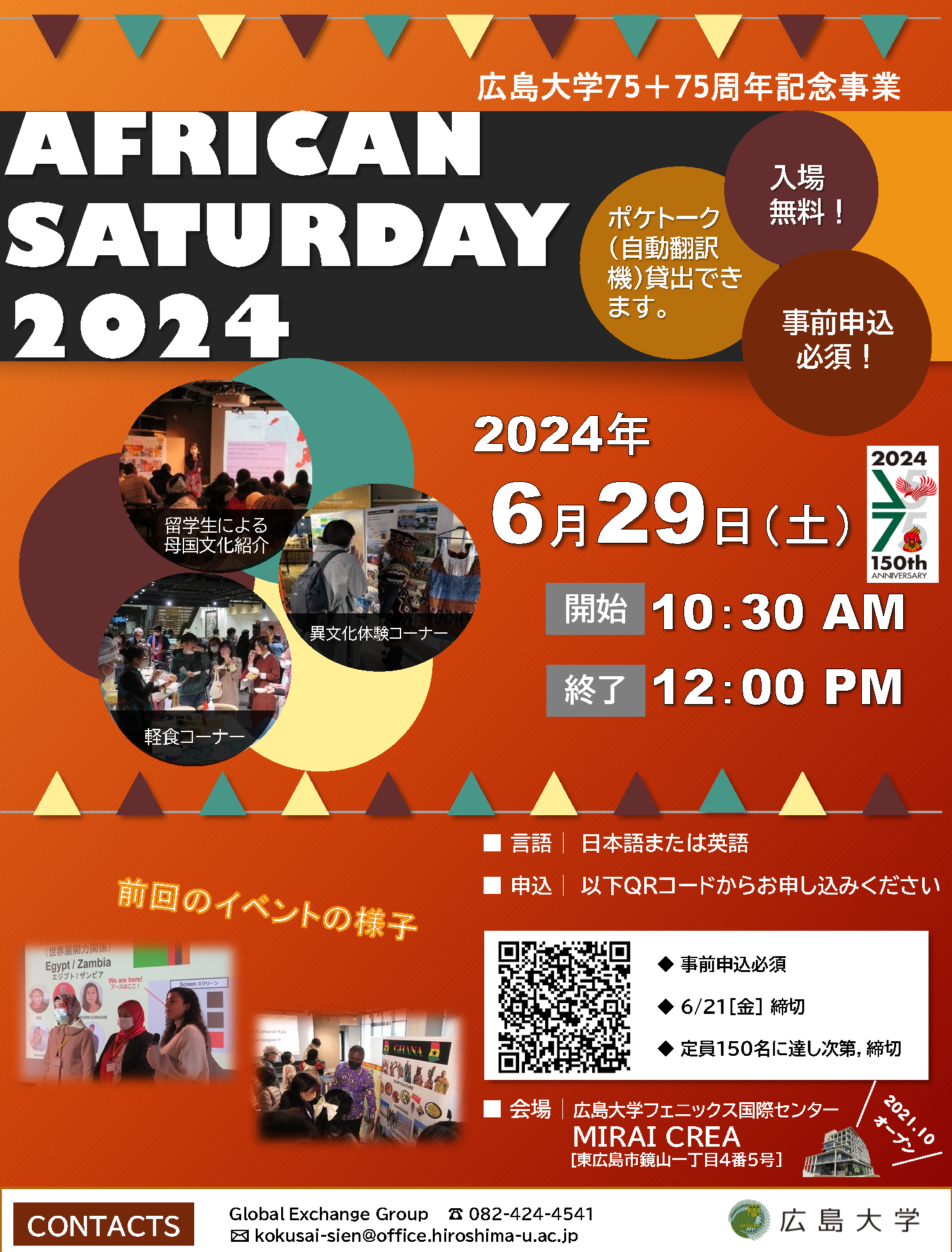 6月29日(星期六)10:30-12:00广岛大学 Miraikurie 举办“非洲星期六”活动(AFRICAN SATURDAY)。 留学生将介绍自己的国家,体验不同的文化。 还将提供茶点。 需提前申请,截止日期为6月21日。更多信息,请点击查看。