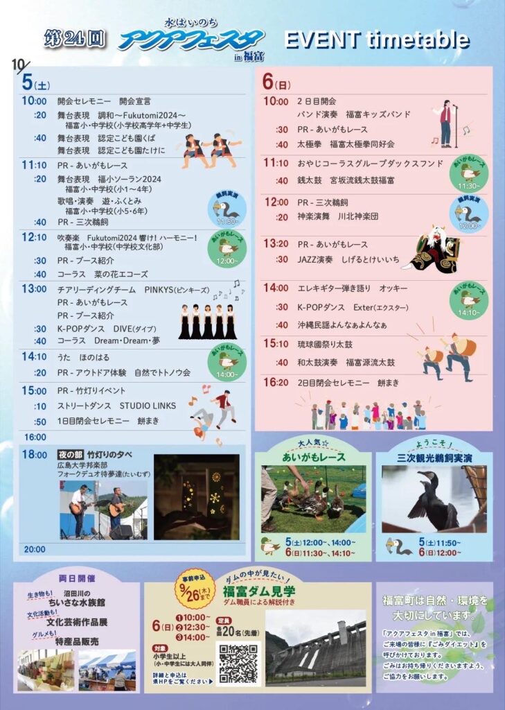 10月5日(土どようび)、6日(日にちようび)道(みち)の駅(えき) 湖畔(こはん)の里(さと)福富(ふくとみ)でアクアフェスタがあります。たくさんのイベントやステージ、おいしいグルメもあります。もっと知(し)りたい人はチラシとホームページを見(み)てください。https://aqua-festa-in-fukutomi.jp/