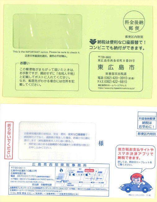 Thư chứa giấy nộp thuế sẽ được gửi tới những người sở hữu xe ô tô. Xe hạng nhẹ (xe máy hay xe ô tô từ 660cc trở xuống), sẽ nhận được phong bì màu xanh lá có dấu của thành phố Higashihiroshima. Xe ô tô lớn hơn 660cc sẽ nhận được phong bì màu trắng. Hãy hoàn tất việc nộp thuế xe ô tô muộn nhất vào ngày 2/6 (Thứ Hai).
