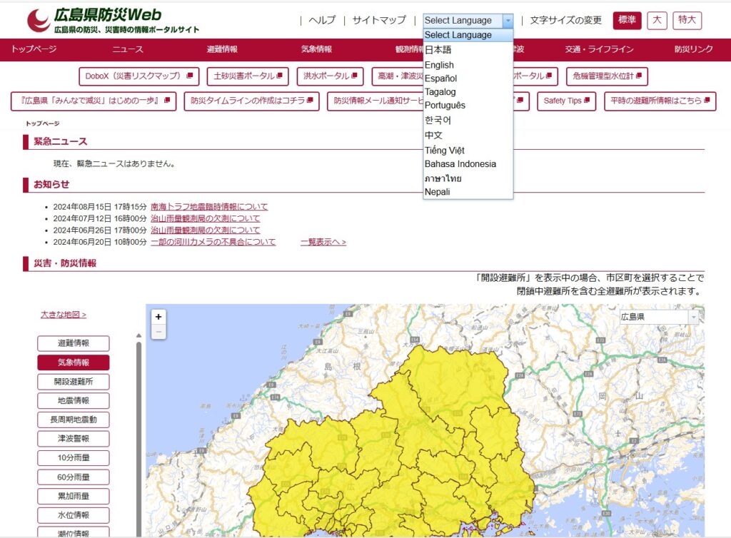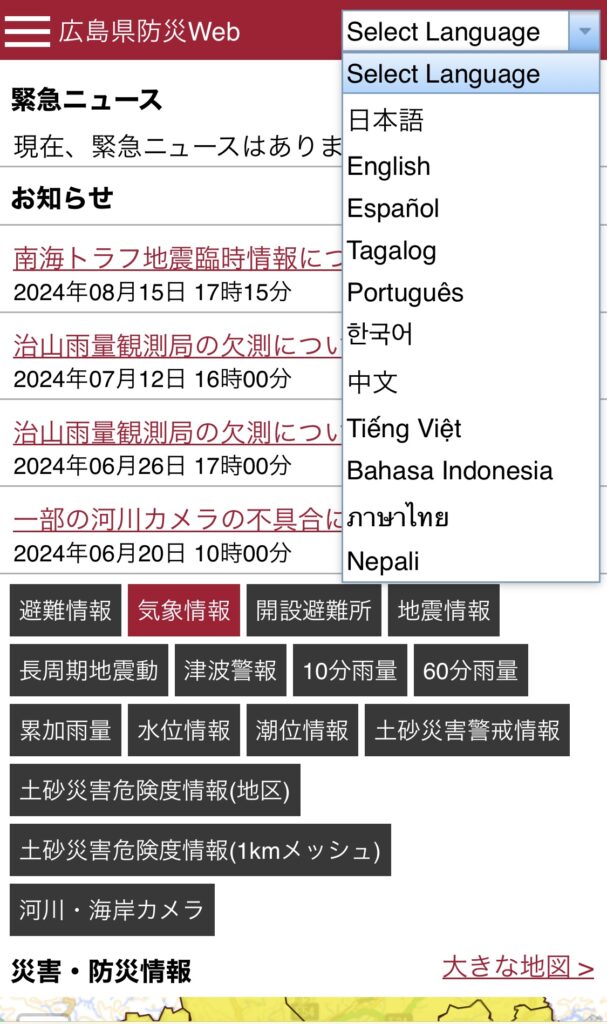 Hiện nay có một cơn bão lớn đang đổ bộ vào Nhật Bản. Trên trang web phòng chống thiên tai của tỉnh Hiroshima, bạn có thể xem các thông tin về bão, mưa lớn, các cảnh báo thiên tai cũng như thông tin về nơi lánh nạn bằng 11 ngôn ngữ khác nhau. Xin vui lòng lựa chọn ngôn ngữ tại mục "Select language" ở phía trên bên phải trang web.