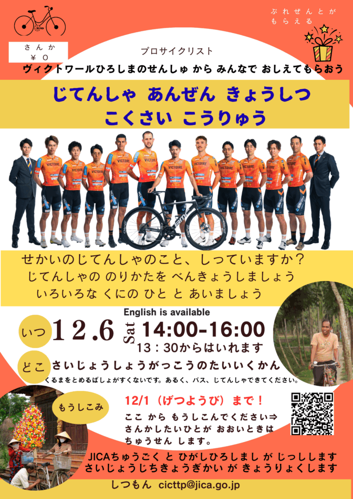 Dia 6 de dezembro (sábado), das 14h00 às 16h00, haverá uma [Aula de Segurança para Ciclismo x Intercâmbio Internacional] no ginásio da Escola Primária Saijo. Ciclistas da Victoire Hiroshima ensinarão as regras do ciclismo. É gratuito (0 ienes). Necessário fazer inscrição. Para mais informações, consulte o folheto.