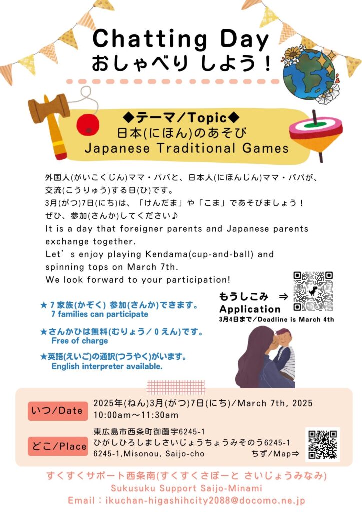 Vào ngày 7 tháng 3 (Thứ sáu) từ 10:00~11:30, tại Saijo-cho Misonou sẽ diễn ra sự kiện "Ngày trò chuyện" (Chatting Day). Đây là sự kiện mà các phụ huynh người nước ngoài có thể cùng giao lưu với các phụ huynh người Nhật. Mọi người còn có thể cùng chơi các trò chơi truyền thống của Nhật Bản như Kendama và Koma. Tham gia miễn phí. Có phiên dịch tiếng Anh. Để biết thêm thông tin chi tiết, vui lòng xem tờ rơi.