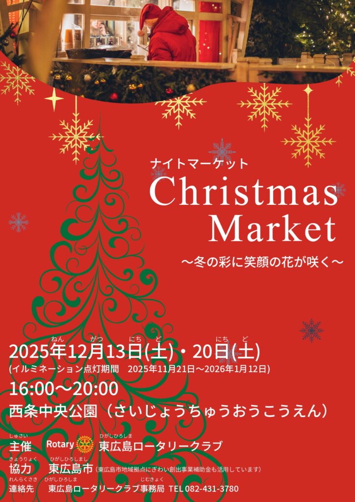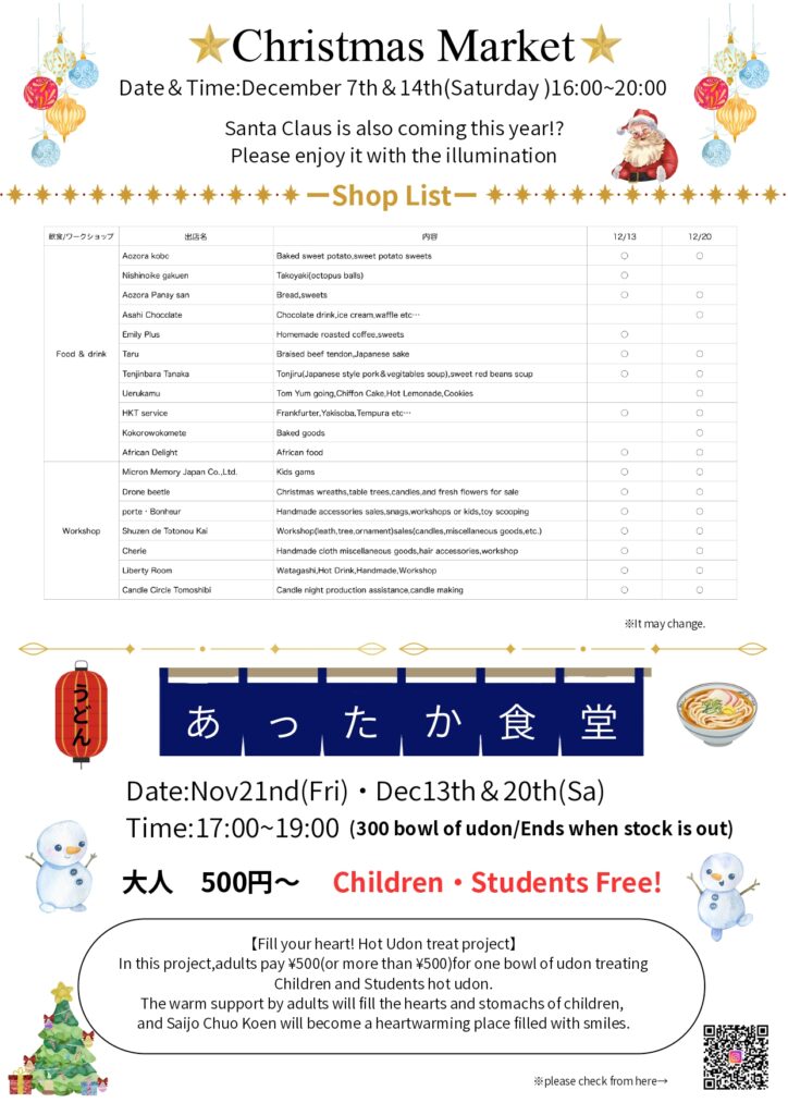 Um mercado de Natal será realizado no Chuo Koen (Parque Central de Saijo) das 16h00 às 20h00 nos dias 13 (sábado) e 20 (sábado) de dezembro. Você poderá aproveitar diversas atividades, incluindo compras e workshops, enquanto admira a iluminação natalina. Como parte do projeto "Refeição Aconchegante", o macarrão udon estará disponível por 500 ienes para adultos e gratuitamente para crianças e estudantes. Para mais informações, consulte o folheto