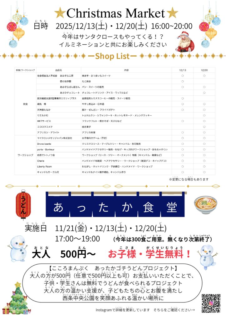 12月13日(土:おようび)と20日(土:どようび)の 4:00PM から 8:00PMまで、西条中央公園(さいじょう ちゅうおう こうえん)で、クリスマス マーケットが あります。イルミネーションを見(み)ながら、買い物(かいもの)やワークショップなど、いろんなことが楽(たの)しめます。「あったか食堂(しょくどう)」プロジェクトでは、大人(おとな)500円、子(こ)どもと学生(がくせい)は無料(むりょう:¥0)で、うどんが 食(た)べられます。もっと知(し)りたい人(ひと)は、チラシを見(み)てください。