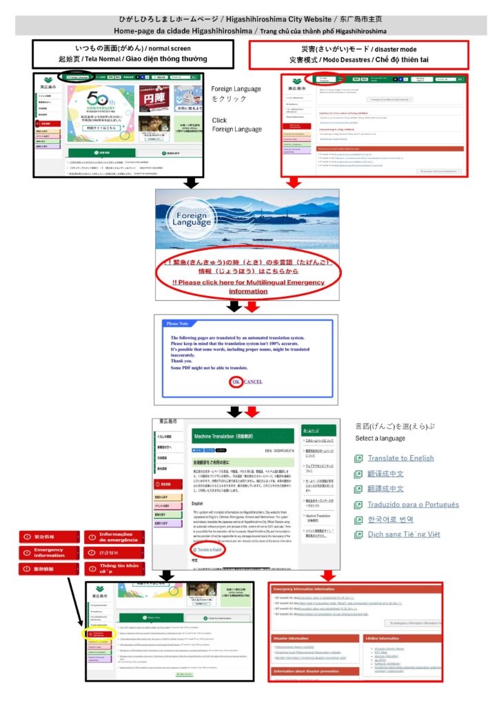 Mỗi khi có phát sinh cảnh báo về thiên tai như mưa to, bão, động đất lớn, trang chủ của thành phố Higashihiroshima sẽ thay đổi sang chế độ cảnh báo thiên tai. Thông tin về các nơi lánh nạn cũng sẽ được đăng tải. Các thông tin này có thể sử dụng chức năng dịch tự động để xem bằng tiếng Anh, tiếng Trung, tiếng Bồ Đào Nha, tiếng Việt, tiếng Hàn. Xin vui lòng làm theo hướng dẫn như các bước trên ảnh.