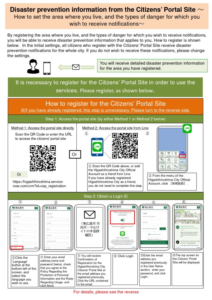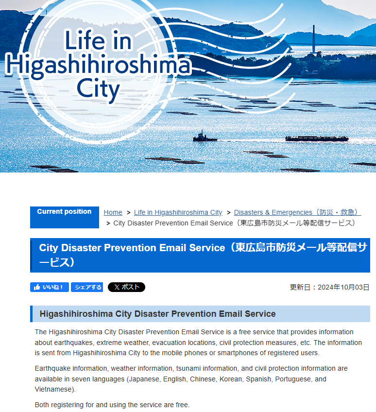 【City Disaster Prevention Email Service】【关于东广岛市的防灾邮件通知服务】【Sobre o serviço de informações por e-mail sobre prevenção de desastres da cidade de Higashihiroshima】【Về dịch vụ gửi mail phòng chống thiên tai của Thành phố Higashihiroshima】【東広島市(ひがしひろしまし)の防災(ぼうさい)メール配信(はいしん)サービスについて】
