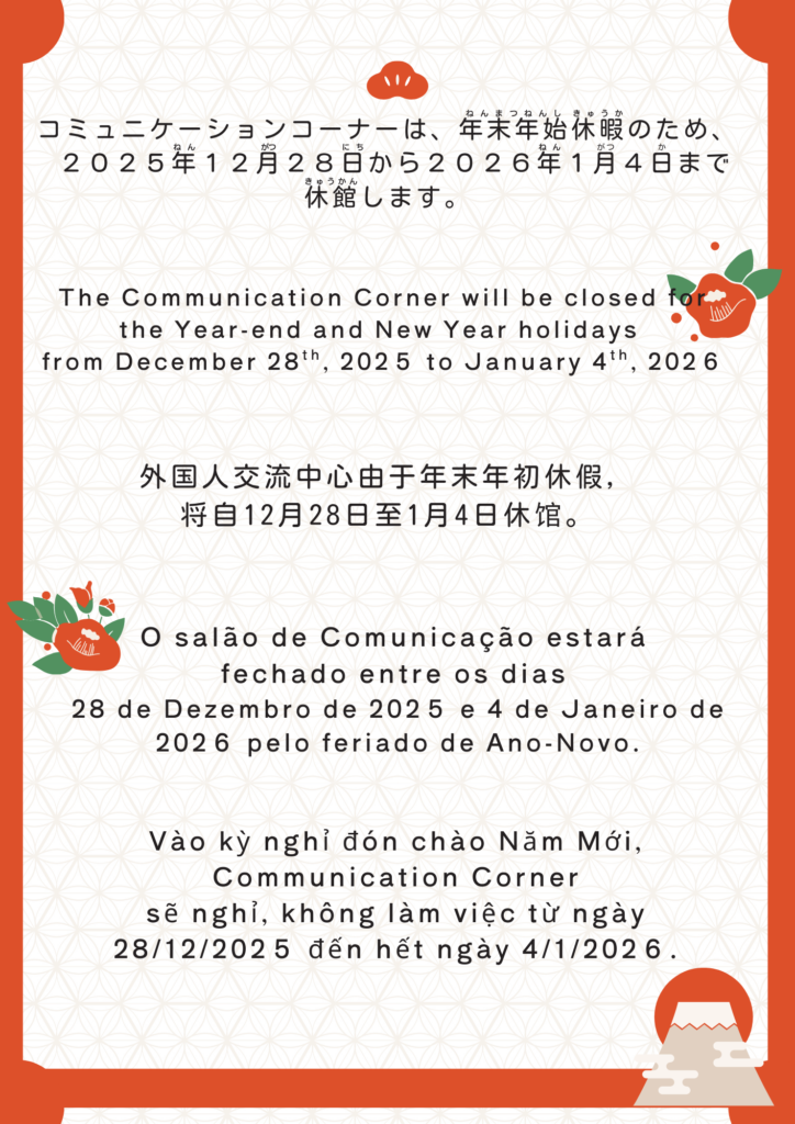 - 【Closure for Year-end and New Year holidays at the Communication Corner】【外国人交流中心的年末年初休息通知】【Salão de Comunicação estará fechado durante feriados de final e início de ano】【Lịch nghỉ Tết Dương lịch của Communication Corner】【コミュニケーションコーナーの年末年始(ねんまつねんし)休(やす)み】