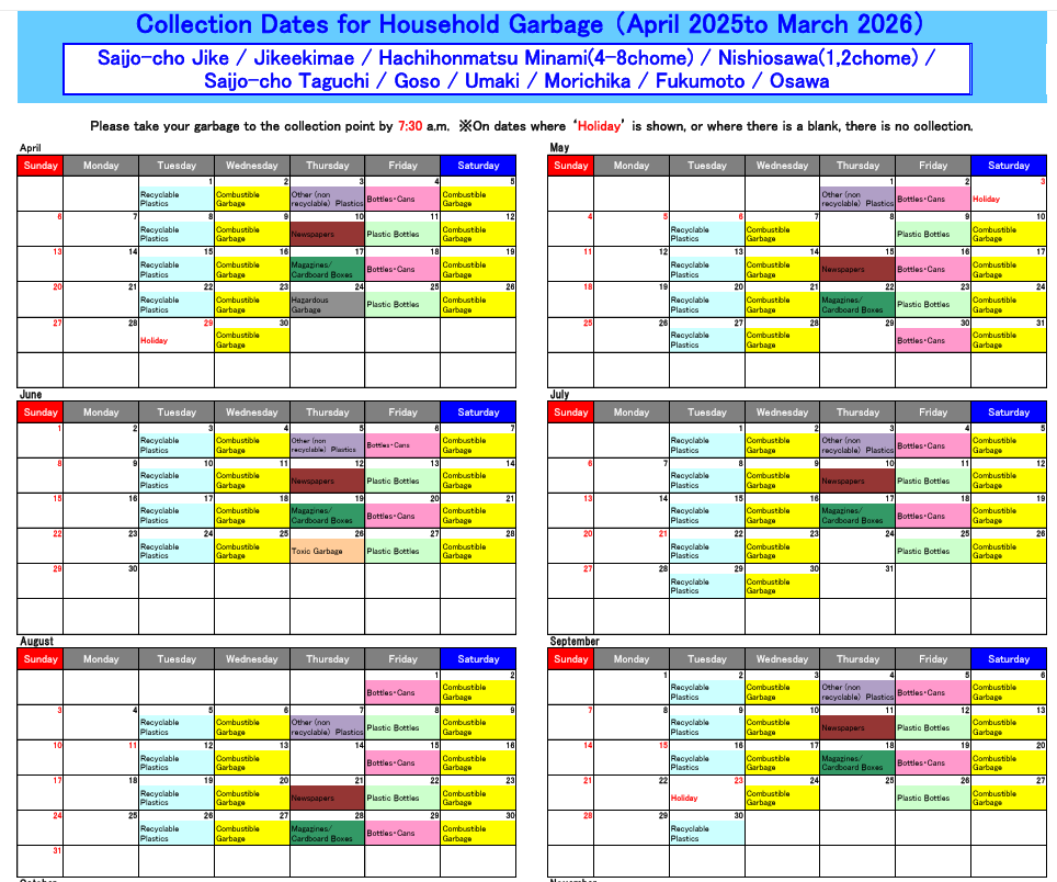 Đã phát hành lịch thu gom rác từ tháng 4 trở đi. Sẽ có sự khác nhau tùy vào từng khu vực nên hãy kiểm tra lịch thu gom tại nơi mình sinh sống. Có bản dịch bằng tiếng Anh, tiếng Trung, tiếng Bồ Đào Nha, tiếng Việt, tiếng Tagalog, tiếng Indonesia.