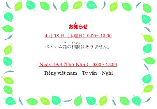 【Communication Corner】【コミュニケーションコーナー】 2024年4月11日 最終更新日時 : 2024年4月11日 kihara Xin vui lòng lưu ý rằng ngày 18/4 (Thứ Năm) sẽ không có nhân viên tư vấn tiếng Việt tại quầy Communication Corner. 4月18日(木もくようび)は、ベトナム人(じん)の相談員(そうだんいん)がいません。注意(ちゅうい)してください。 Bluesky